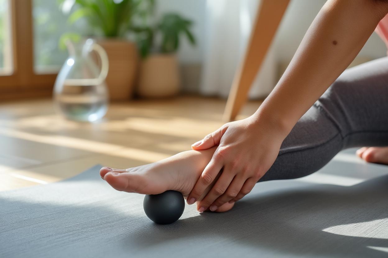 Technique accessible : appliquez une pression circulaire sur la plante du pied pendant 1 à 2 minutes, puis utilisez une balle de massage sous l’avant-pied et effectuez des mouvements d’avant en arrière. En position debout, faites rouler la balle en contrôlant la pression selon la tolérance.