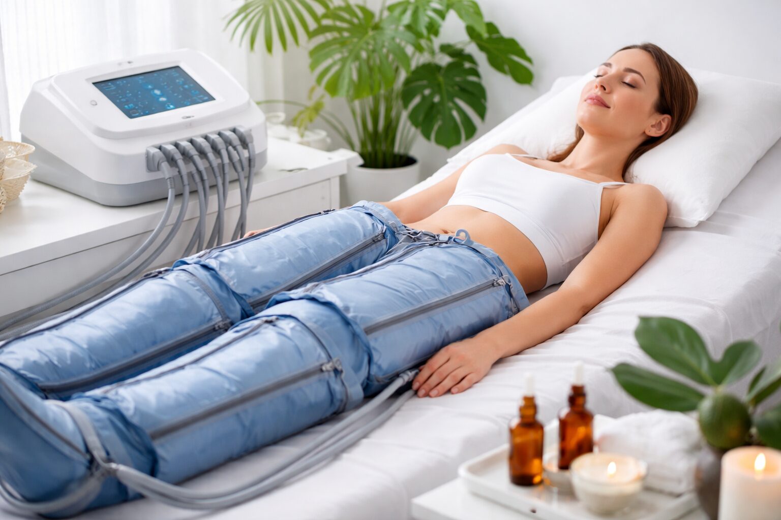La pressothérapie consiste à envelopper des zones du corps (jambes, bras, abdomen) dans des manchons ou bottes gonflables reliés à une unité de contrôle. L’appareil génère des cycles de compression et de décompression afin d’imiter un mouvement de pompage, ce qui favorise l’écoulement de la lymphe et du sang périphérique.